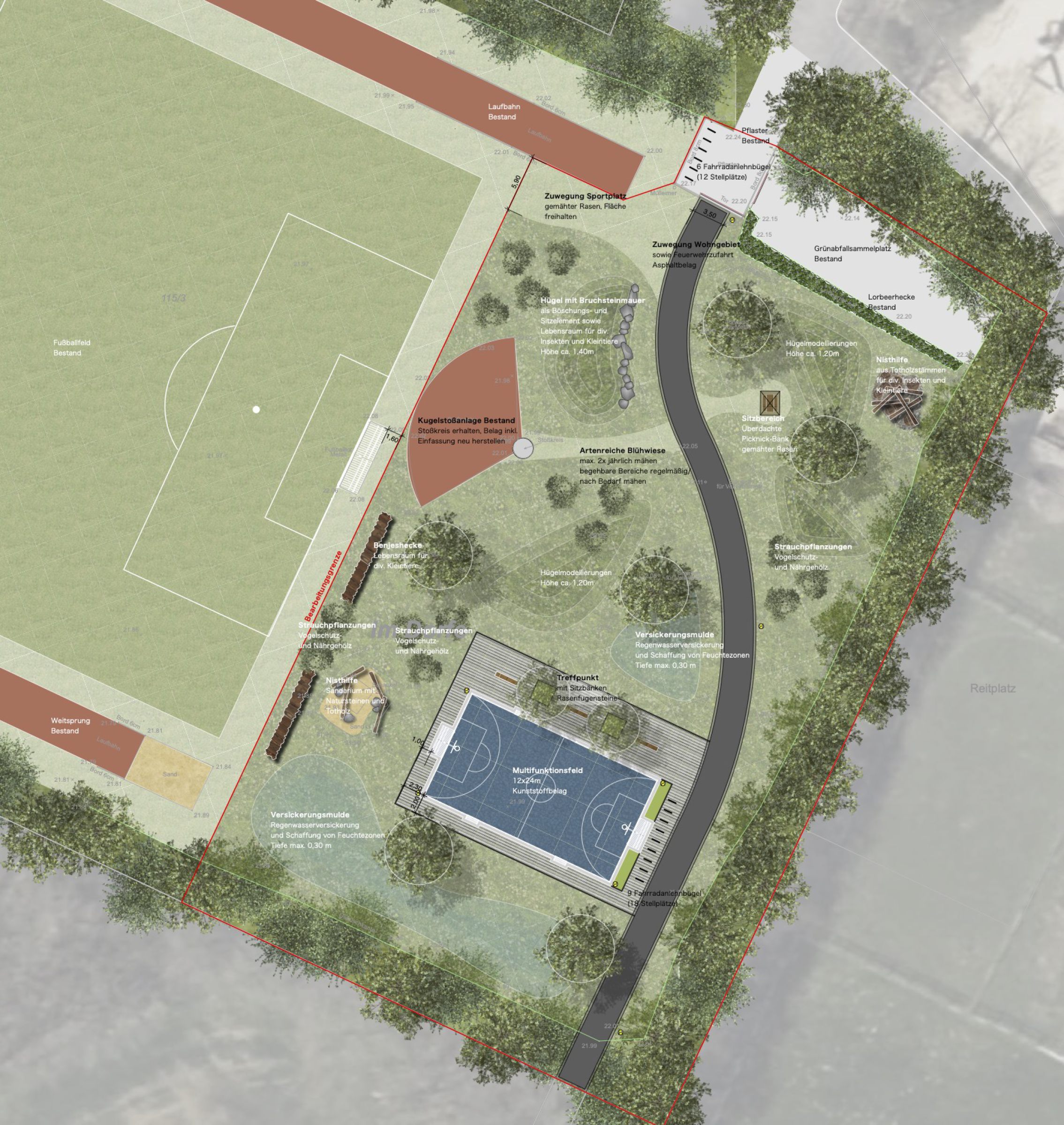 In der Gemeinde Menslage im Artland entsteht auf einer nicht genutzten Grünfläche eine neue fußläufige Wegeverbindung zwischen der Grundschule und des neu geplanten Baugebietes. Ein Soccerplatz, Aufenthalts- und Spielmöglichkeiten sowie artenreiche Grünflächen, angereichert mit Biotopelementen und Wasserrückhaltung und -versickerung ergänzen die Gesamtfläche.