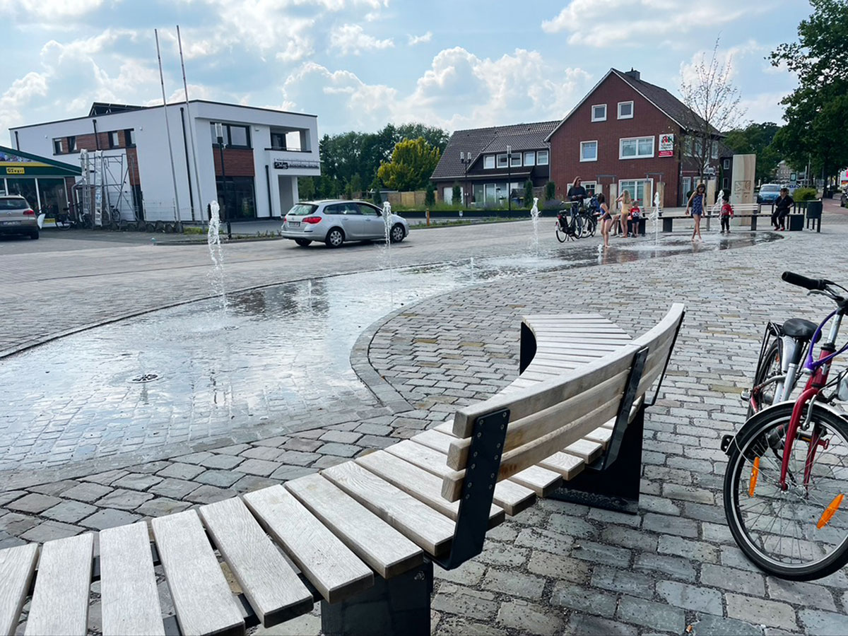 Nach ca. 3 monatiger Bauzeit wurde das Eingangsportal zum Bürgerpark in Molbergen Ende 2020 fertig gestellt. Für die Gestaltung wurden die Materialien und Leuchten aus dem Bürgerpark aufgegriffen. Der Platz übezeugt durch eine ruhige Gestaltung und wird von der Bevölkerung gut angenommen. Im Mai konnte endlich das Fontänenfeld in Betrieb genommen werden.