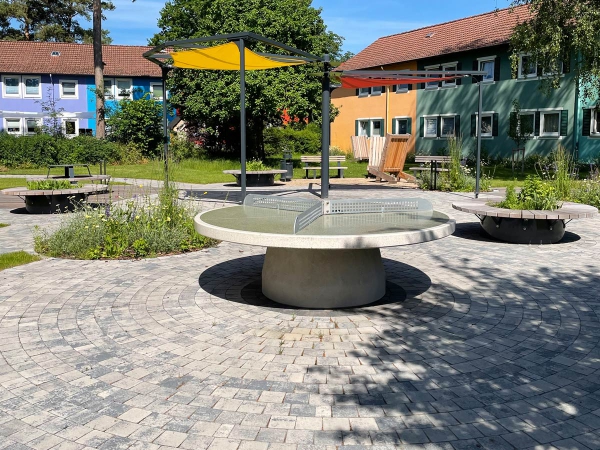 Anlage eines öffentlich zugänglichen Platzes im Rahmen des Städtebauförderprogramms 'Soziale Stadt' in Espelkamp. Hier wurden insbesondere die Bedürfnisse der Wohngemeinschaft 'Wittekindhof' im Rahmen von Workshops berücksichtigt.