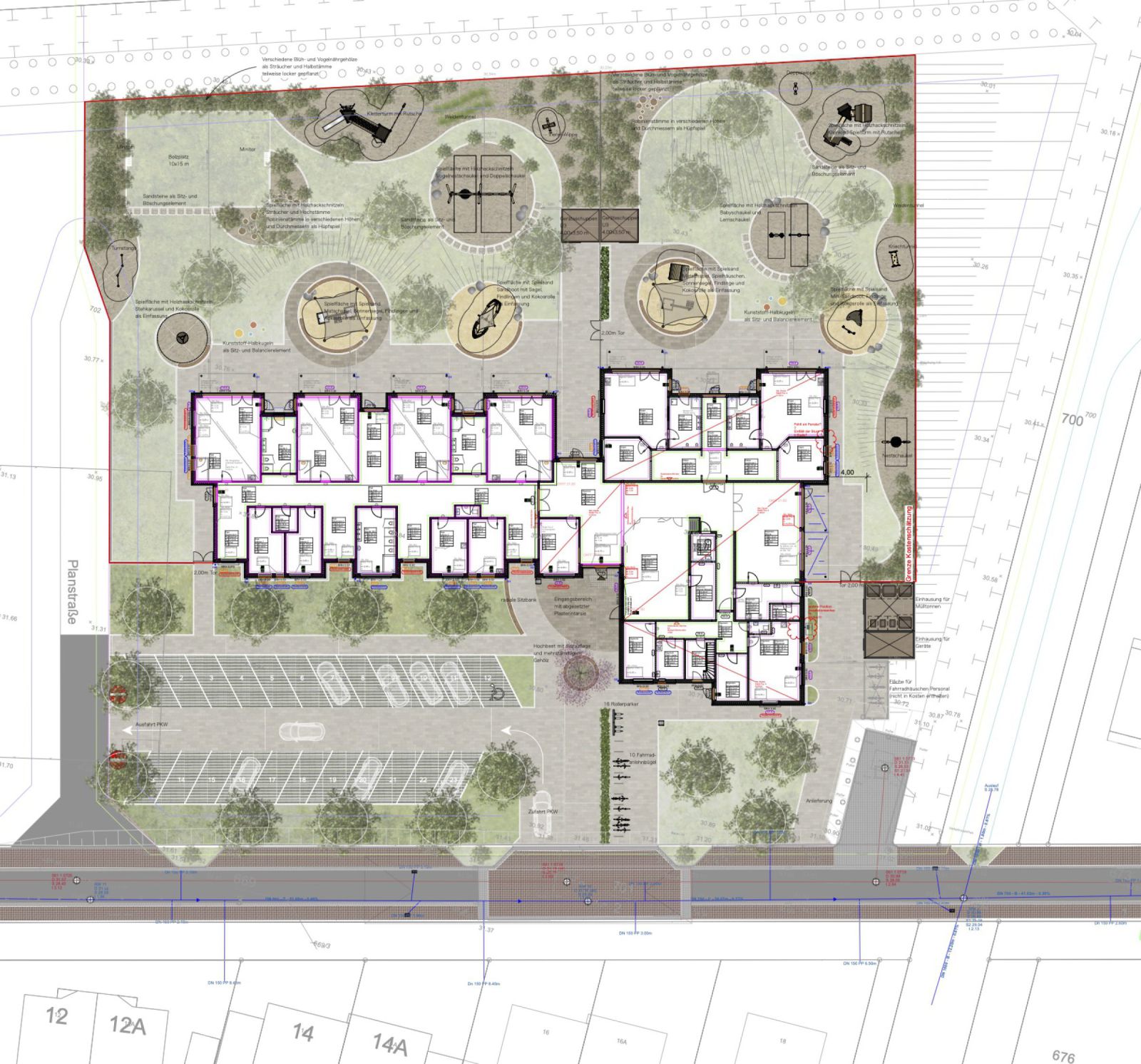 Zu den gestalterischen Aspekten werden bei uns regelmäßig Themen wie Schwammstadt und Baumrigolen, Regenwasserbewirtschaftung, standortangepasste Stauden- und Gehölzverwendung geplant.