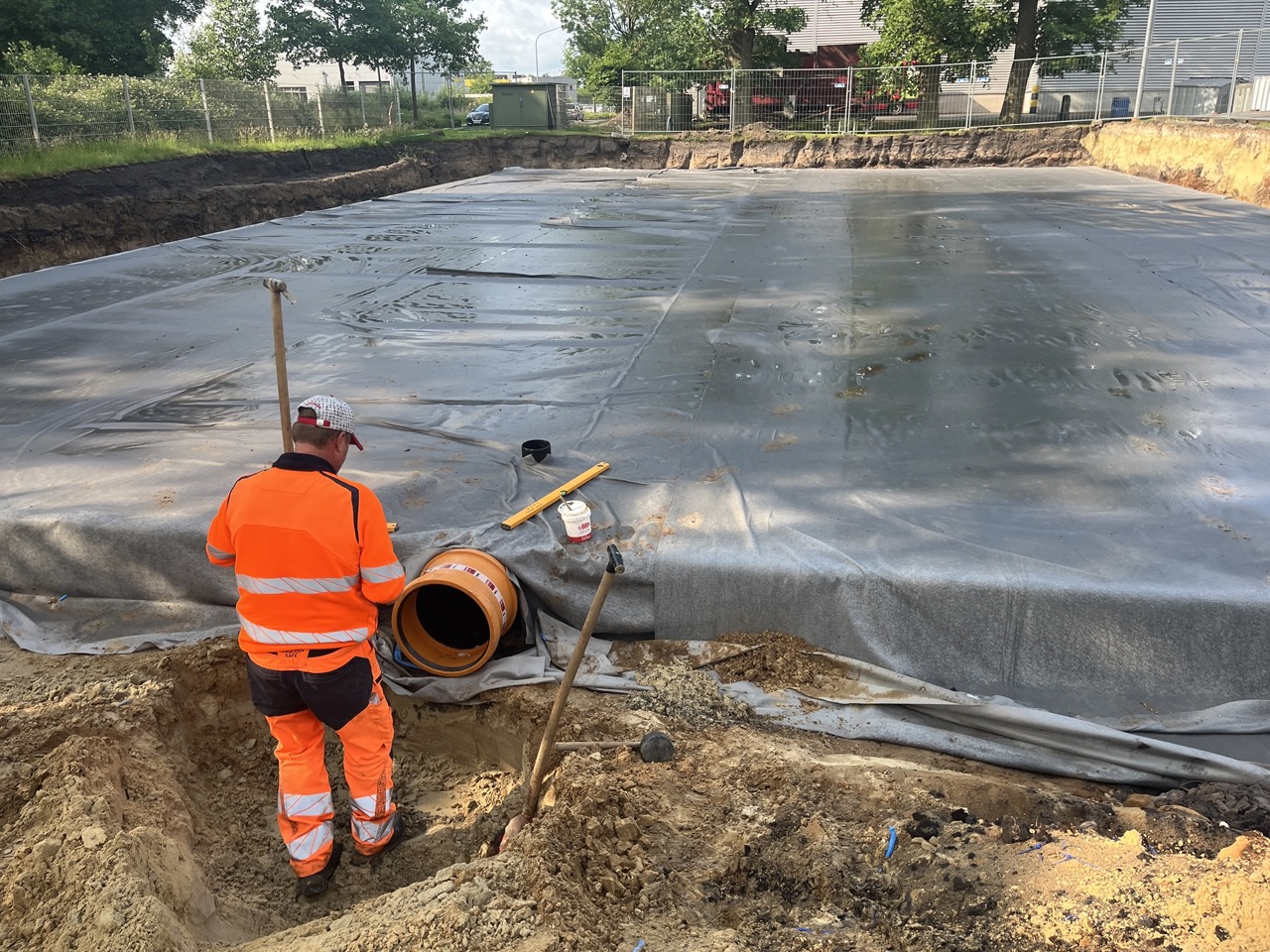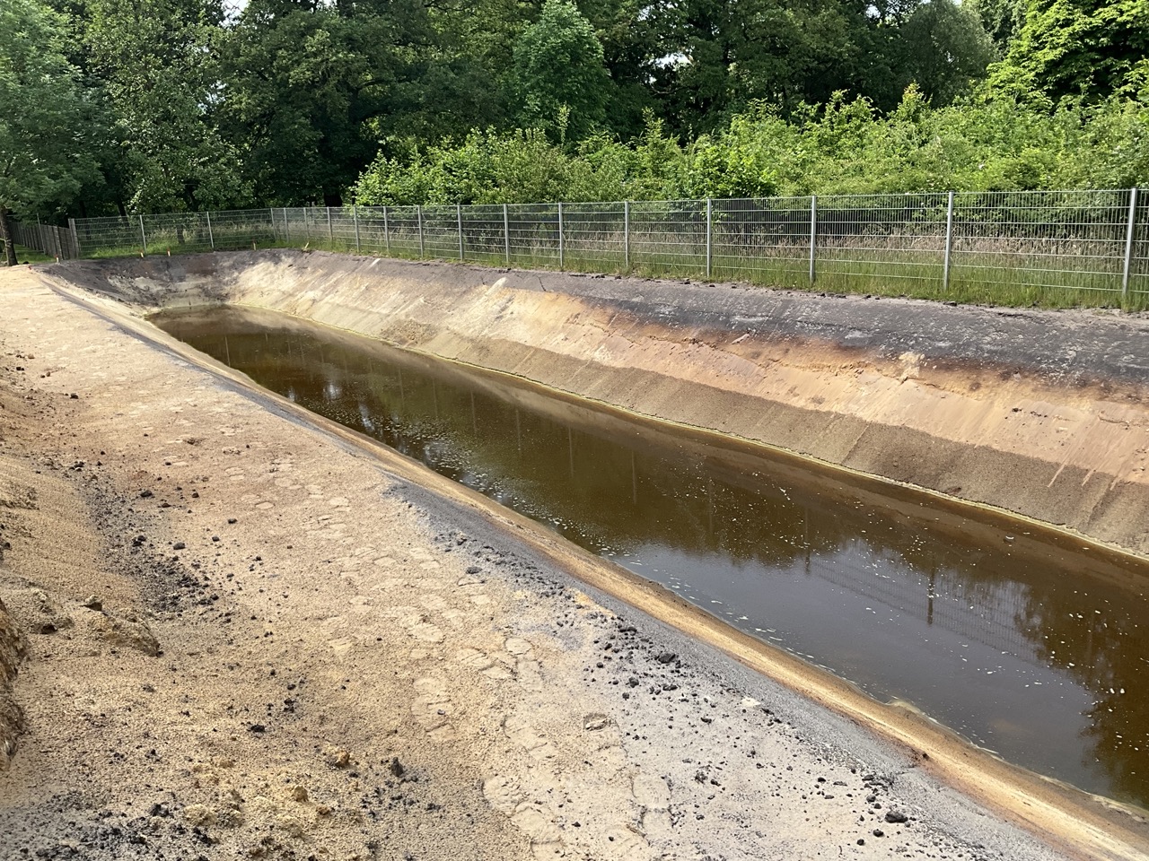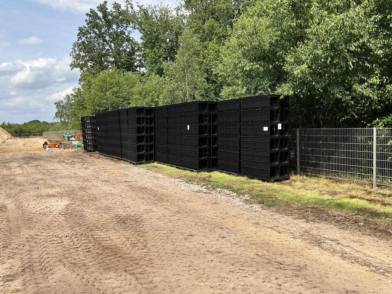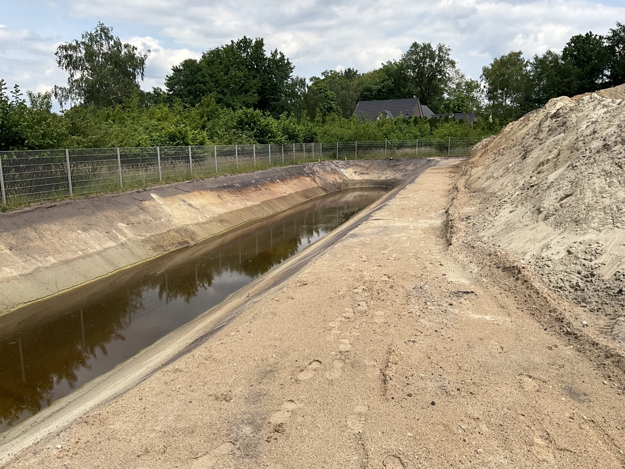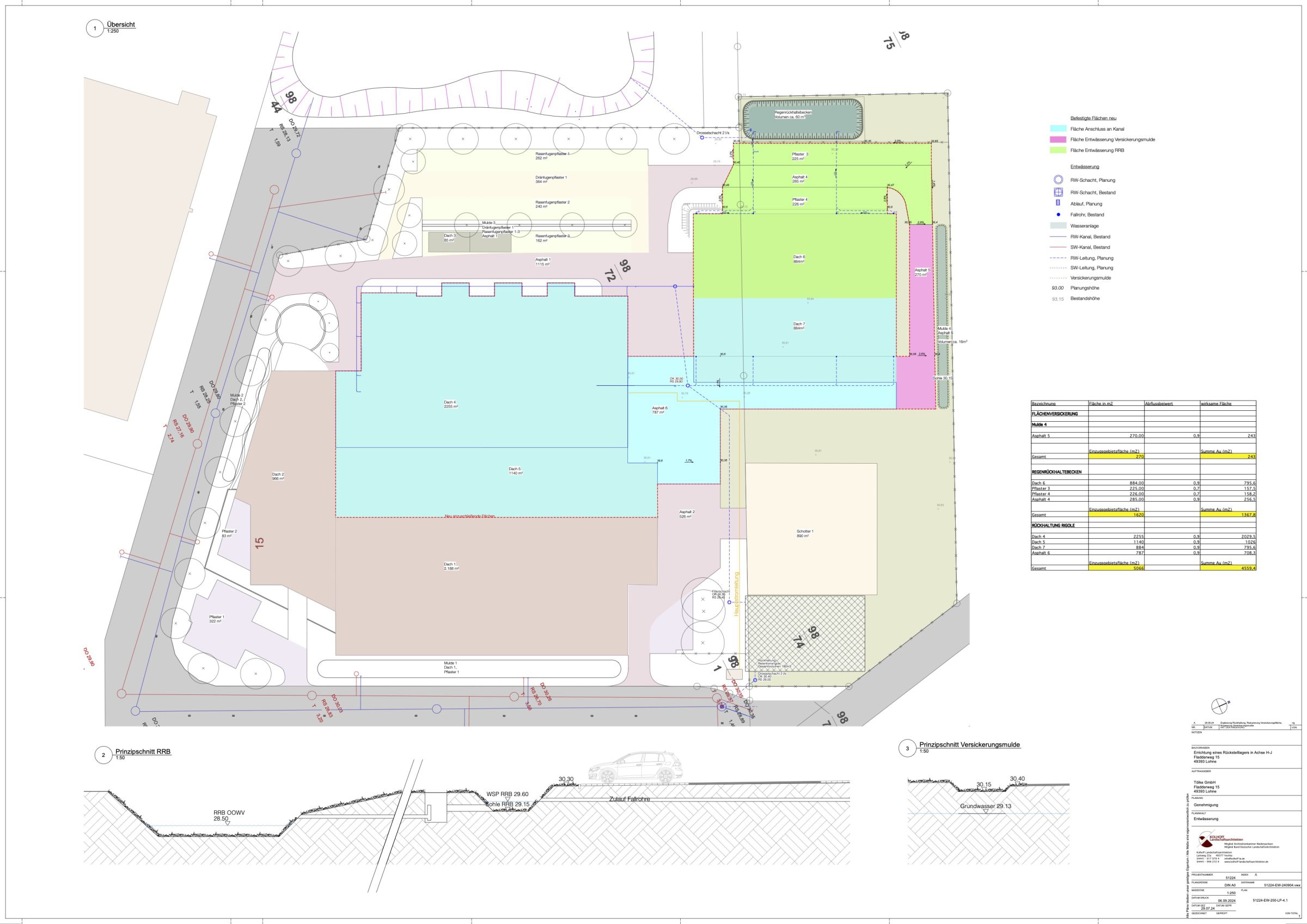 Erstellung der notwendigen Berechnungen für die Regenrückhaltung und gedrosselte Einleitung sowie für Niederschlagsversickerungen in Teilbereichen. Auf dem Gelände der Maschinenfabrik Franz Tölke GmbH wurden im Lauf der letzten 20 Jahre fast alle Instrumente zur Regenwasserbewirtschaftung eingesetzt: Muldenversickerung, Mulden-Rigolen-Versickerung, Rückhaltung in Regenrückhaltebecken mit gedrosselter Einleitung in den Kanal, Bau von Regenrückhalteboxen mit gedrosselter Einleitung in den Kanal. Die Bilder zeigen den Bau von Rückhalteboxen und erdmodelliertem Rückhaltebecken für die derzeit in Bau befindlichen Hallen.