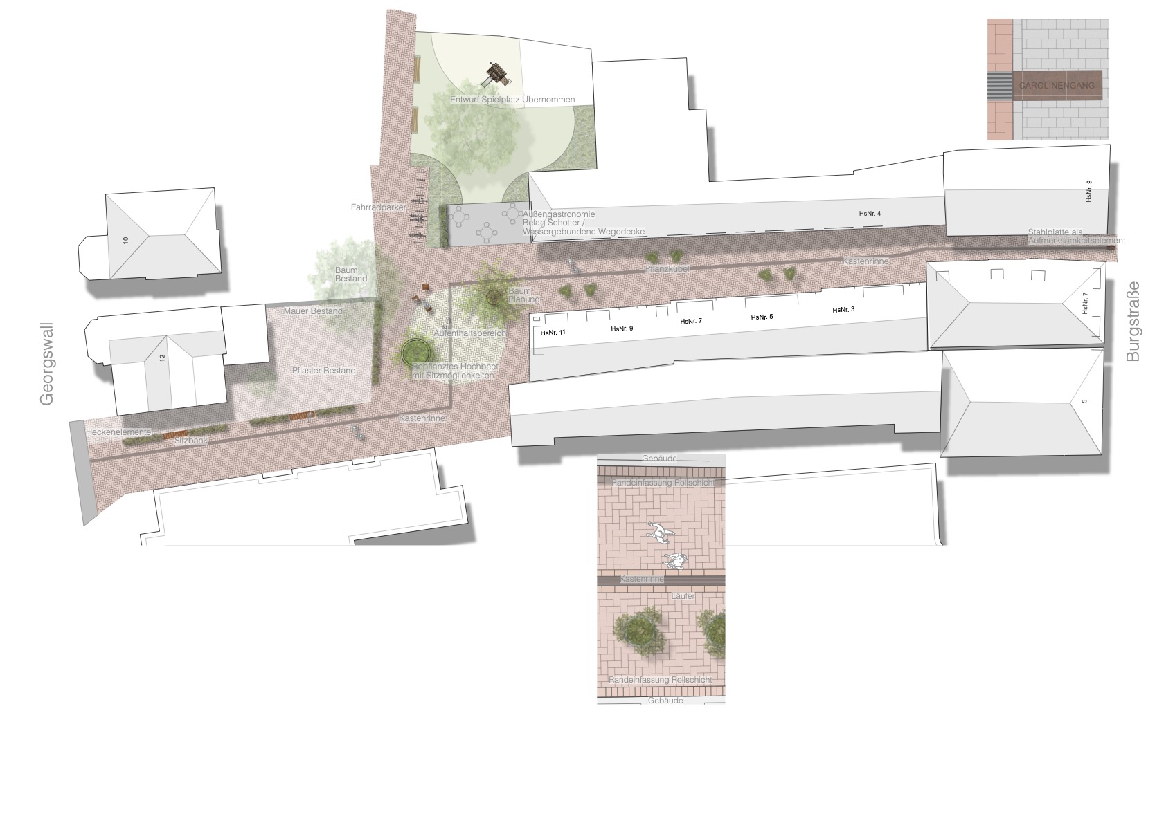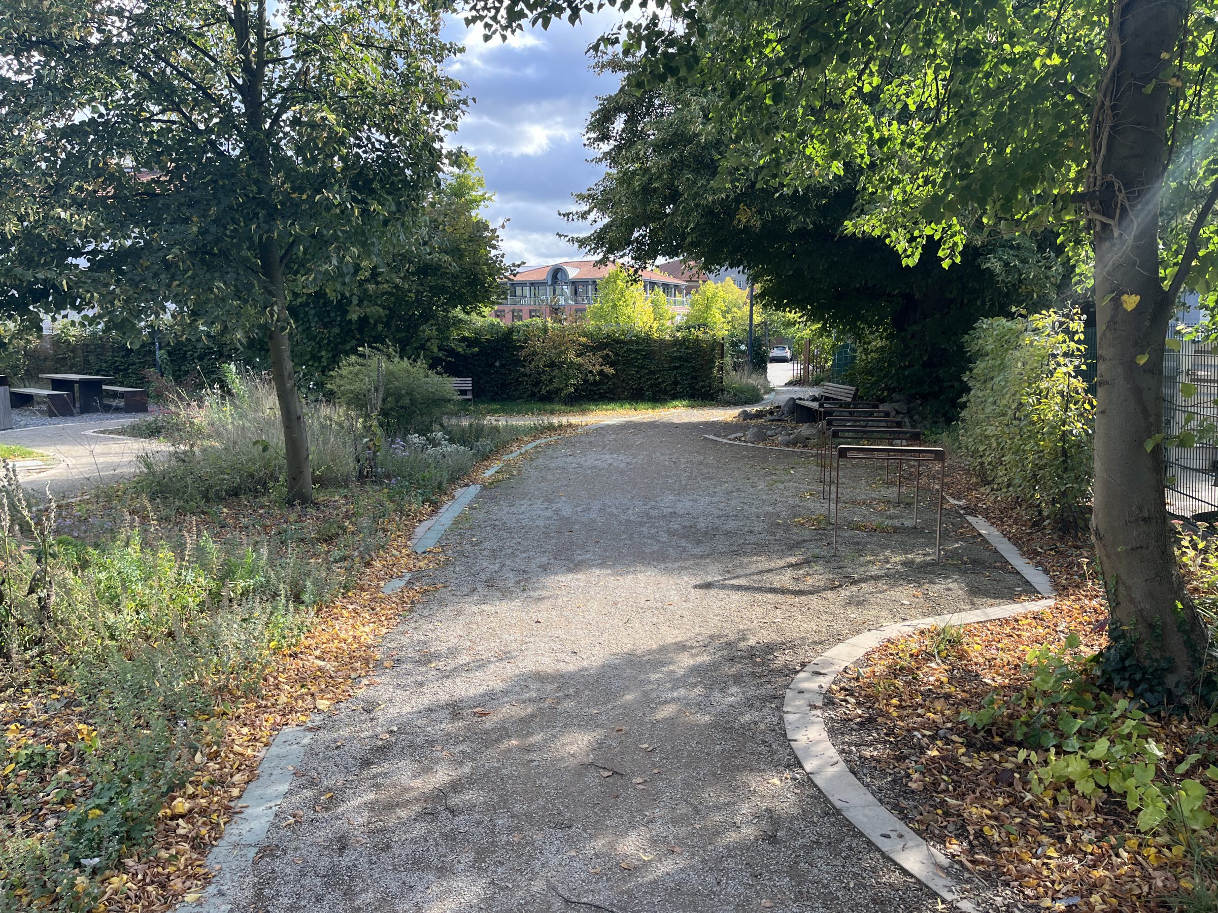 Anlage einer innerstädtischen Wegeverbindung mit unterschiedlichen Aufenthaltsschwerpunkten: Mittels eines grünen Pflasterstreifens werden ein Inklusionsspielplatz, der öffentlich zugängliche Bürogarten der Stadtverwaltung und ein 'Wilder Garten' miteinander verbunden.