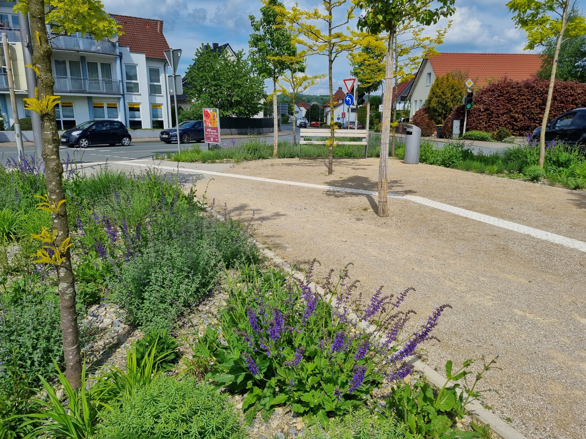 Im Rahmen des Programms 'Perspektive Innenstadt' wurde 2022 das Parkdeck am Dürrenberger Ring neu gestaltet. Nach einer tiefgründigen Beseitigung der vorhandenen Pflanzung aus bodendeckenden Gehölzen und Japanischem Knöterich erfolgte eine abwechslungsreiche Staudenpflanzung mit hoher ökologischer Vielfalt.