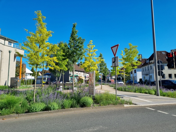 Im Rahmen des Programms Perspektive Innenstadt erfolgte 2022 der Umbau der Kreuzung von einer, zu 95% befestigten Verkehrsinsel zu einer Grünen Insel inmitten des Verkehrs. Anfallendes Niederschlagswasser wird komplett der Vegetation zugeführt. Klimaresiliente Gehölze bilden auf Dauer einen schattigen Platz, auf besonderen Wunsch aus der Bevölkerung wurden mittlerweile Bänke zwischen den Staudenpflanzungen aufgestellt.